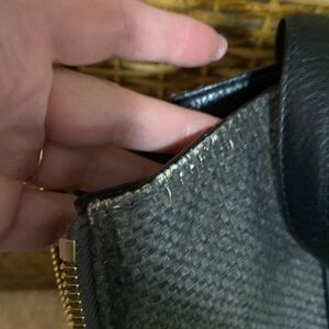 This is in vintage condition. There is wear on the corners, I pictured each corner. The handles are perfect. The inside is perfect with one zipper compartment and three expandable pockets. The expandable sides work perfectly, and they have a zipper pull of a large leather tassel. There’s a lock and two little keys that are around one of the straps.