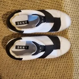 Stylish DKNY slip-on sneakers in white and black. Perfect for casual wear.