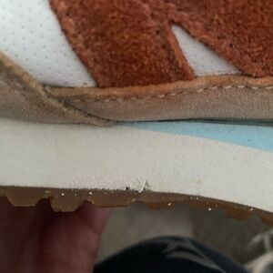 Classic New Balance sneakers with white and brown design. Ideal for everyday style.