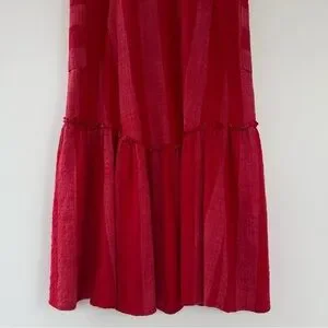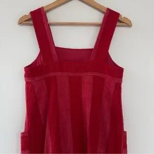 Vertical Wide Striped Red and Pink Striped Dress with 2 Front Pockets, 94% Cotton 6% Acrylic. Good weight to the fabric like a soft burlap like texture which would travel well and easy to pack. Hand wash cold.