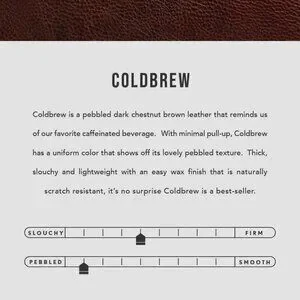 Color: Coldbrew is a pebbled dark chestnut brown leather that reminds us of our favorite caffeinated beverage. With minimal pull-up, Coldbrew has a uniform color that shows off its lovely pebbled texture. Thick, slouchy and lightweight with an easy wax finish that is naturally scratch resistant, it's no surprise Coldbrew is a best-seller.
