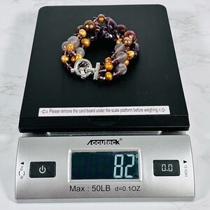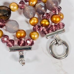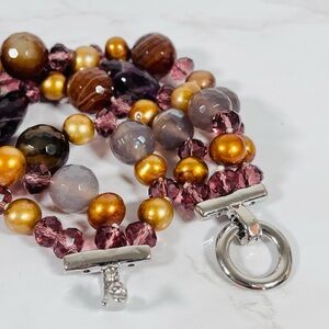 Three strand bracelet featuring purple and gold beads and silver tone clasp.