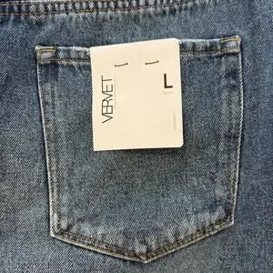 Vervet Women's Denim Mini Skirt. In the color blue. Tagged size large. This women's Vervet Claudia mini skirt features denim fabric, factory distressing, a five pocket design, and rear pockets. Style number VT676. In new with tag condition - NWT.