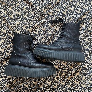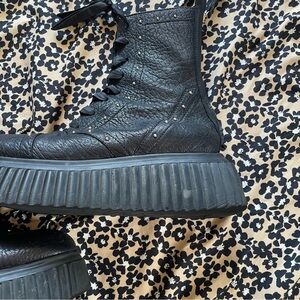 Milagros lace-up boots from AGL featuring black, leather, stud embellishment, front lace-up fastening, round toe and ridged rubber sole.