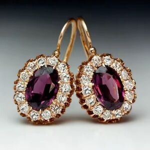 These stunning earrings feature a deep purple gemstone surrounded by sparkling accents, set in a luxurious gold finish. Perfect for adding a touch of elegance to any outfit.