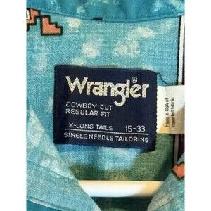 This Vintage Wrangler Shirt is a classic American Western piece with a Tepee Arrowhead design perfect for cowboys and Western enthusiasts alike. Made of cotton and featuring a regular fit, this multicolor shirt boasts a button-up closure, long sleeves, and a point collar for a stylish look. With a chest size of 38 inches and a size 15, this shirt is machine washable and perfect for casual wear. Made in the United States, this vintage piece from the trusted brand Wrangler is a must-have for any man's wardrobe.