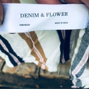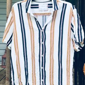 Stylish button-down with bold stripes. Features a mix of white, black, and tan. Perfect for casual outings.