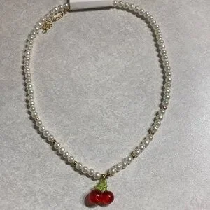 This elegant pearl necklace features a charming cherry pendant, perfect for adding a playful touch to any outfit. The necklace combines classic white pearls with a vibrant red cherry, creating a unique and stylish accessory.