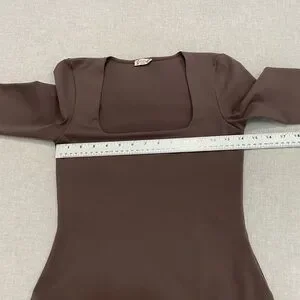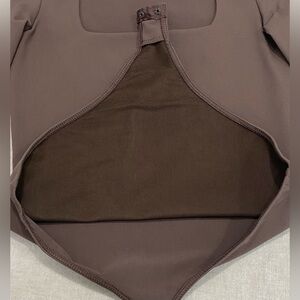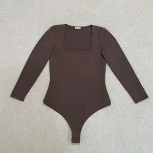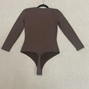 This bodysuit is pre-owned and has a small unstitching defect, see the photo. Chic chocolate bodysuit with long sleeves. Perfect for layering.