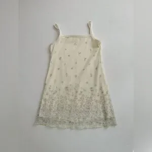 This sweet dressing is giving 90’s vibes with straight fit, spaghetti straps a sheer overlay and cotton lining. A adorable sparkly floral detail on the bottom.