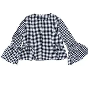 Félicité Gingham open front navy and white. 3/4 bell sleeves. 100% cotton Size 2 = small.