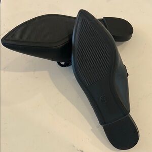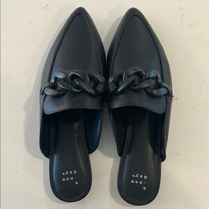 These black mules from a new day feature a minimalist design with a sleek pointed toe and a sophisticated chain-link detail. The smooth, matte finish and backless style make them easy to slip on and off, offering a modern and elegant look.