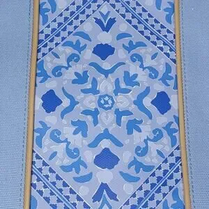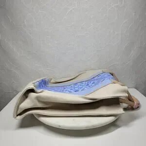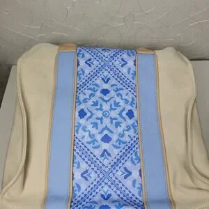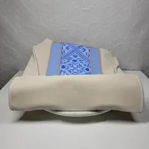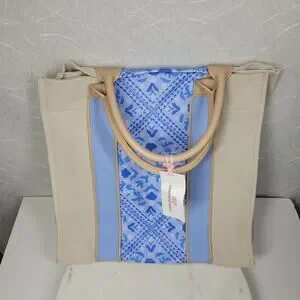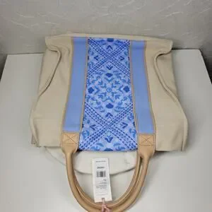 Stylish tote with blue patterned center. Tan handles and sides. Perfect for everyday use.