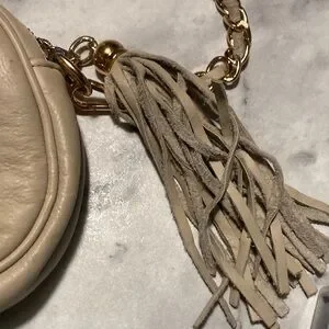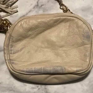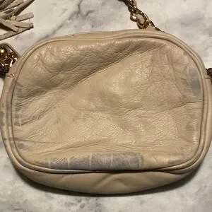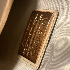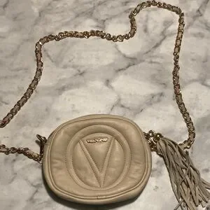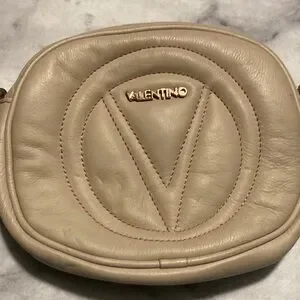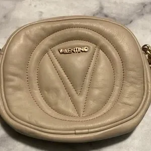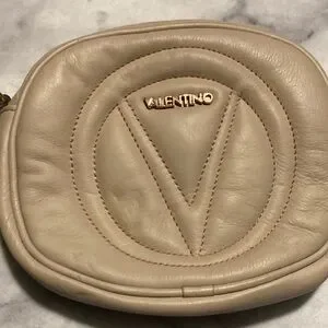 This luxurious Valentino crossbody bag is crafted in a sophisticated cream leather with a quilted pattern, offering a timeless elegance. The bag features a distinctive gold chain strap and a flap closure, making it a versatile accessory for any occasion. Its structured design and iconic Valentino emblem add a touch of high-end luxury to your ensemble. The bag has some stains, that's why I'm selling it for less.