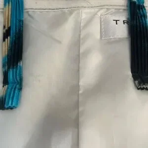 Callout: I think the dress must have originally meant to tie behind the neck. The bodice has boning and the back of the dress had rubber like a strapless dress. It appears that someone sewed the straps into the back of the dress. It is symmetrical and looks good. If you wanted to go back to strapless/tue around the neck, you could just take out the stitches