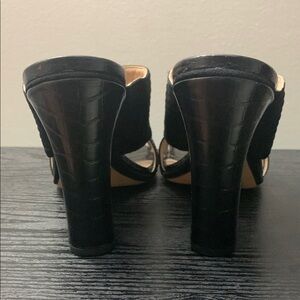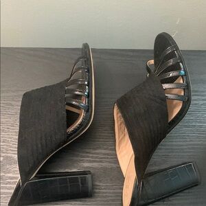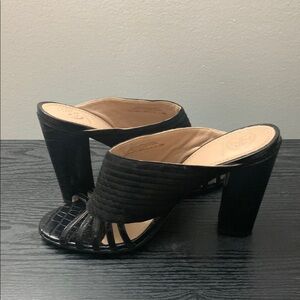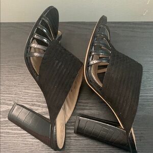 Features: Open Toe and Approx. 4” Block Style Heel. Leather Upper, Lining, and Sole