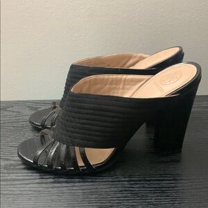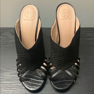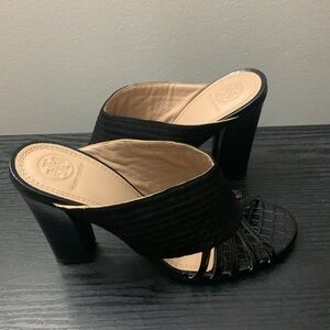 Tory Burch Mules with Woven Suede and Patent Leather.
