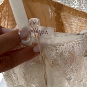 This V. Chapman mini dress in pristine white exudes elegance with its intricate lace detailing and romantic silhouette. The delicate lace patterns and scalloped trim add a touch of sophistication, making it perfect for special occasions. Its structured design ensures a flattering fit, while the ethereal quality of the fabric enhances its timeless appeal.