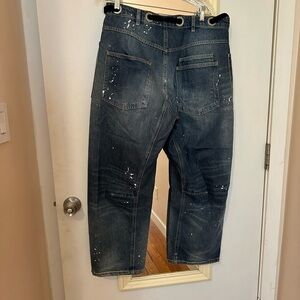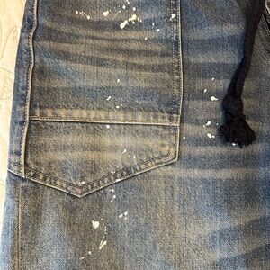Features: Distressed detailing throughout, paint splatter features, oversized patch pockets, contrast drawstring waist, pull-on style