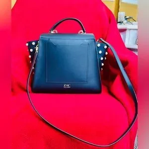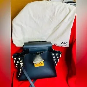 The Zac Posen satchel showcases a sophisticated design with its black leather body and gold-tone hardware. Its structured silhouette and elegant details make it a timeless accessory for any fashion-forward individual.
