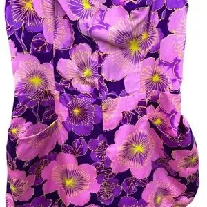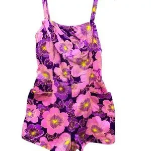 Vintage late 1960s Playsuit by Paradise Hawaii. Purple and pink tropical Hawaiian print polyester. The romper has a dropped bodice, front pockets, elastic waist / back bust, a built in cotton/poly liner on the bottom and a back zipper. It is suitable for use as a swimsuit. The straps are adjustable in back using two button settings and they can be crossed over and buttoned as well.