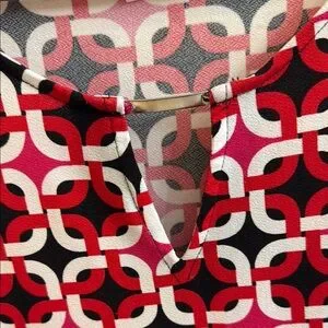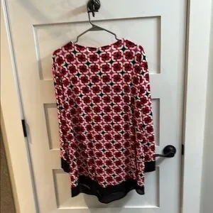 Stylish tunic with geometric pattern. Features red and black design. Long sleeves and V-neckline. Perfect for casual wear.