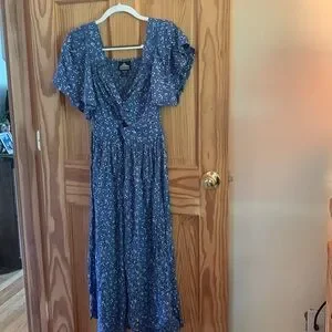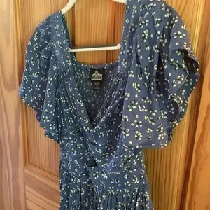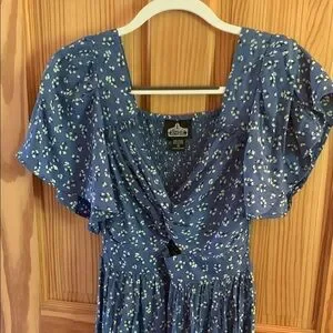 A lovely and cut floral blue dress with delicate white floral print. Perfect for the summer and warm season. Features elegant puff and flouncy sleeves and a gathered neckline. Only worn once, looking to swap for something different. Size is a women’s small.
