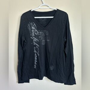 Stylish black long sleeve shirt with graphic design. Perfect for casual wear.