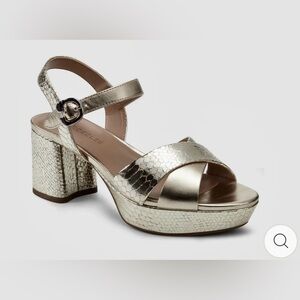 Platform sandal with a modern elegance, chunky yet lightweight - the Cosmos features a block heel, crossover straps that frame the foot, and an ankle strap with a polished signature buckle. Crafted with soft gold leather and python embossed mirror metallic leather, they are the epitome of easy elegance and will instantly elevate any look.