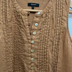 Sleeveless style with a little swing. This spring summer staple can do it all. Featuring pin-tucking up top, shell buttons, and pleat detailing. Made from 100% European flax linen—an eco-friendly, and resource light material.