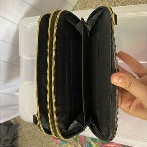 ⭐ 3/$15 Floral Embroidered Black Clutch Wallet W/ Blue Roses & Dual Gold Zippers