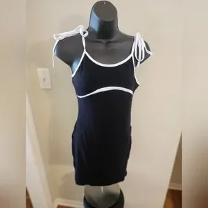 Stylish black dress with white trim and strappy shoulders. Perfect for casual outings.