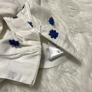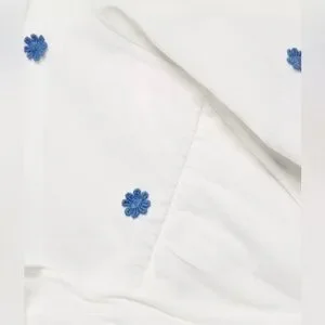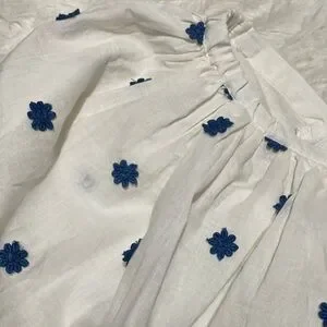 This beautifully made semi-cropped blouse features delicate blue embroidered flowers on crisp white fabric for a fresh, timeless look. The 3/4 puff sleeves add a touch of romance, while the tie-front detail brings a flattering, modern silhouette. Perfect for summer, this top pairs classic “old money” elegance with an easy, boho vibe. Style it with high-waisted denim, linen trousers, or a flowy skirt for effortless warm-weather chic.