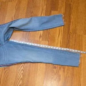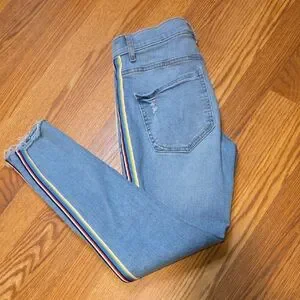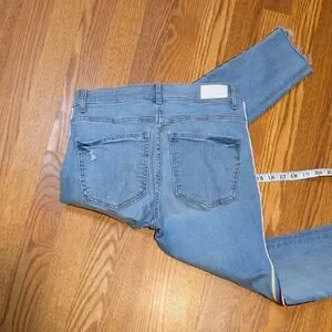 These Express jeans in a striking blue color offer a modern ankle-cropped fit, perfect for a chic and casual look. The subtle stripe detail along the outer seam adds a touch of uniqueness to these versatile jeans.