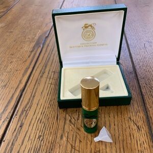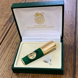 Elegant green and gold travel (works well) perfume atomizer in its case with its own funnel for filling and comes in a luxurious box. From the Eastern & Oriental Express.