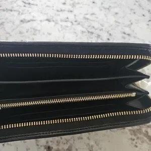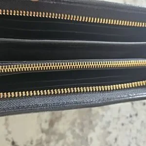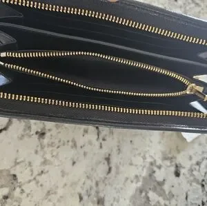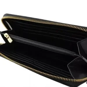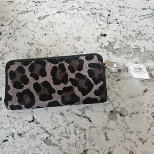 This Coach wallet showcases a striking leopard print in rich brown and black tones, offering a sophisticated touch to your accessory collection. The zip-around design ensures secure storage, while the luxurious pattern adds a bold statement to your everyday essentials.