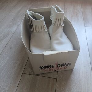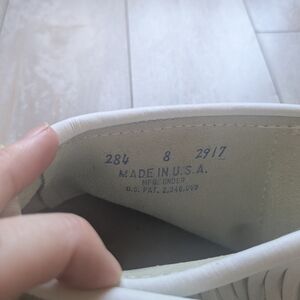 Vintage white ankle boots with fringe detail. Perfect for a chic look. Liners missing.