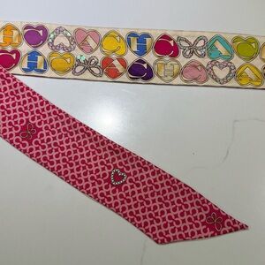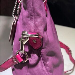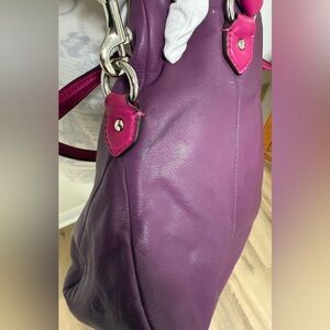 Preowned, EUC, unique, soft leather with no breaks, clean inside, crossbody and hand straps as new, original Coach scarf has all sequins in place, no rips, 2 luggage tags. Purple body, pink and taupe trim, silver toned hardware and purple inside.Handles with 9" drop, longer adjustable/removable strap for shoulder or crossbody wear. See pics for more description. Small darker line on back toward top…see pics…not noticeable really. And a few “wrinkles” in soft leather as this was not stored properly. Such a pretty little bag and colorful especially with the dressy scarf attached…Switch out that black bag! Feel free to ask questions. I ship every day.