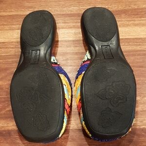 Experience the vibrant charm of Chico's red and pink mules, designed with a lively geometric pattern. These slip-on shoes are perfect for casual summer days, offering a comfortable flat design with an open back for easy wear. light wear shown in pics. very good pre owned condition