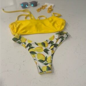 Bright yellow bikini top with lemon print bottoms. Perfect for summer.