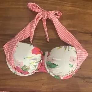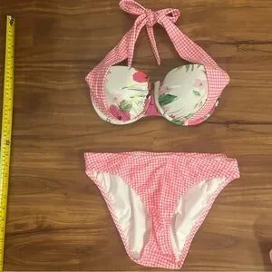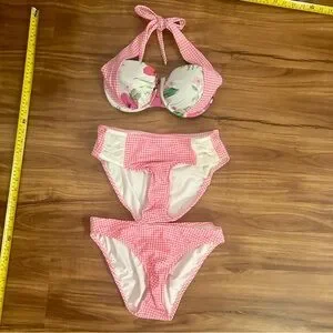 VENUS Pink and white gingham checkered Floral Bikini Set matching top and two sets of bottoms