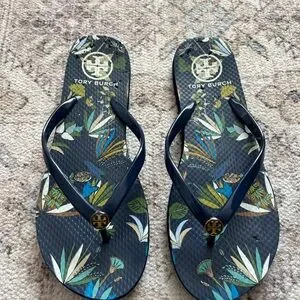 Elegant flip flops with a botanical design. Features navy straps and a mix of green and blue accents.