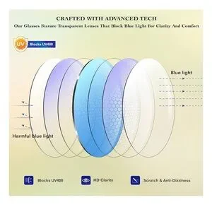 Advanced tech lenses that block harmful blue light. Features include UV400 protection and HD clarity. Scratch and anti-dizziness design.