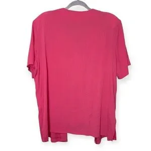 Bright fuchsia pink short-sleeve blouse with “built in” overlay. Shoulder pads, button front.