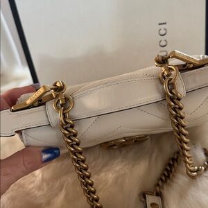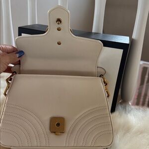 This shoulder bag is crafted of chevron quilted smooth calfskin leather with a heart on the back