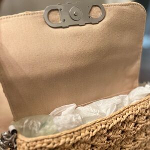 Elevate your style with this Michael Kors tan woven shoulder bag. Featuring a chic design and durable construction, it's perfect for any occasion. The silver chain adds a touch of elegance.
