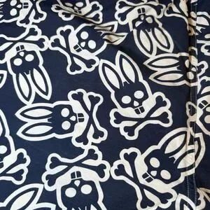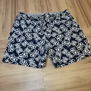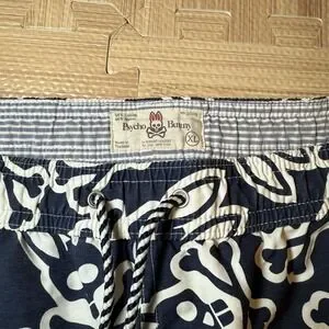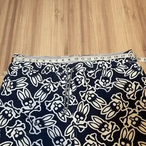 The Psycho Bunny Blue Swim Trunk Shorts are a stylish and vibrant choice for men looking to hit the beach or pool in style. With an all-over print logo in shades of blue and white , these shorts feature an elastic waist, pockets, and a drawstring for a comfortable and secure fit. Made from durable nylon material with a mesh lining, they are perfect for recreational activities in the water. Show off your love for Psycho Bunny with these colorful and eye-catching swim trunks in size XL.