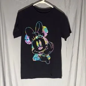 This Disney tee features a striking Minnie Mouse graphic in neon and holographic colors against a black backdrop. The short sleeves and crew neck design make it a comfortable and stylish choice for any casual occasion.