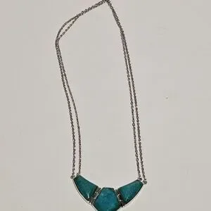 Elegant silver necklace featuring a striking teal geometric pendant. Perfect for adding a pop of color to any outfit.
