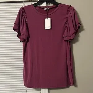 This Green Envelope blouse in a striking red color showcases elegant flutter sleeves and a ruffled design, adding a sophisticated flair to your ensemble. The short sleeves and lightweight fabric make it perfect for both casual and semi-dressy occasions. Enjoy a relaxed fit that effortlessly complements any outfit.